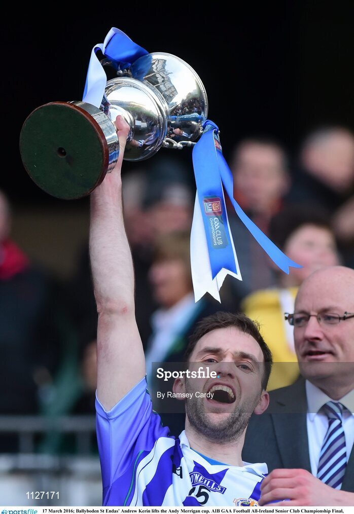 17 March 2016; Ballyboden St Endas' Andrew Kerin lifts the Andy Merrigan cup. AIB GAA Football All-Ireland Senior Club Championship Final, Ballyboden St Endas, Dublin, v Castlebar Mitchels, Mayo. Croke Park, Dublin. Picture credit: Ramsey Cardy / SPORTSFILE