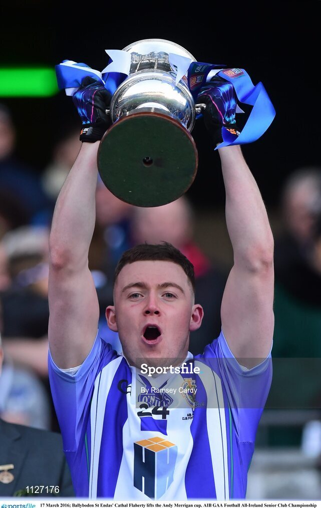17 March 2016; Ballyboden St Endas' Cathal Flaherty lifts the Andy Merrigan cup. AIB GAA Football All-Ireland Senior Club Championship Final, Ballyboden St Endas, Dublin, v Castlebar Mitchels, Mayo. Croke Park, Dublin. Picture credit: Ramsey Cardy / SPORTSFILE
