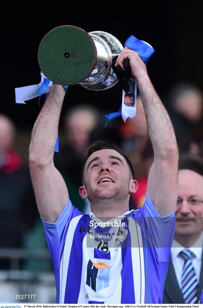 17 March 2016; Ballyboden St Endas' Stephen O'Connor lifts the Andy Merrigan cup. AIB GAA Football All-Ireland Senior Club Championship Final, Ballyboden St Endas, Dublin, v Castlebar Mitchels, Mayo. Croke Park, Dublin. Picture credit: Ramsey Cardy / SPORTSFILE