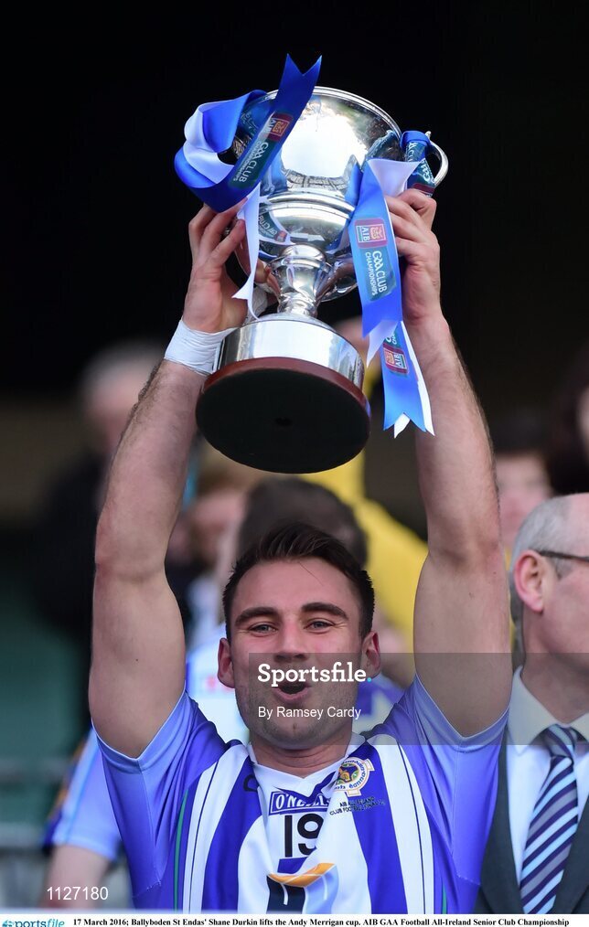 17 March 2016; Ballyboden St Endas' Shane Durkin lifts the Andy Merrigan cup. AIB GAA Football All-Ireland Senior Club Championship Final, Ballyboden St Endas, Dublin, v Castlebar Mitchels, Mayo. Croke Park, Dublin. Picture credit: Ramsey Cardy / SPORTSFILE