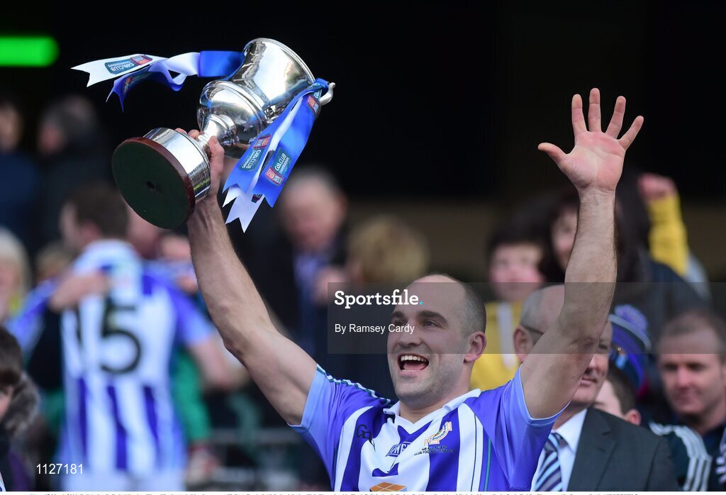 17 March 2016; Ballyboden St Endas' Stephen Hiney lifts the Andy Merrigan cup. AIB GAA Football All-Ireland Senior Club Championship Final, Ballyboden St Endas, Dublin, v Castlebar Mitchels, Mayo. Croke Park, Dublin. Picture credit: Ramsey Cardy / SPORTSFILE