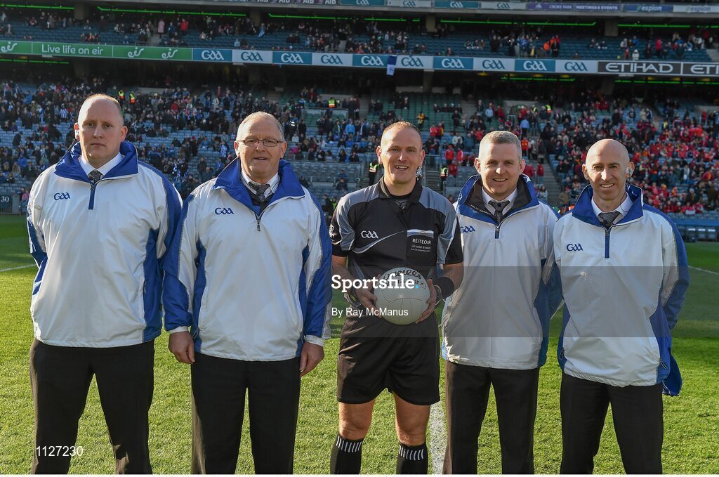 17 March 2016; Referee Conor Lane with his umpires Pat Kelly, DJ O'Sullivan, John Joe Lane and Raymond Heggarty. AIB GAA Football All-Ireland Senior Club Championship Final, Ballyboden St Endas, Dublin, v Castlebar Mitchels, Mayo. Croke Park, Dublin. Picture credit: Ray McManus / SPORTSFILE