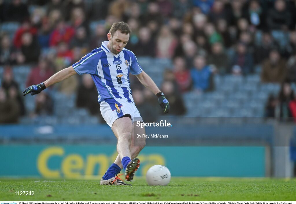 17 March 2016; Andrew Kerin scores the second Ballyboden St Endas' goal, from the penalty spot, in the 15th minute. AIB GAA Football All-Ireland Senior Club Championship Final, Ballyboden St Endas, Dublin, v Castlebar Mitchels, Mayo. Croke Park, Dublin. Picture credit: Ray McManus / SPORTSFILE