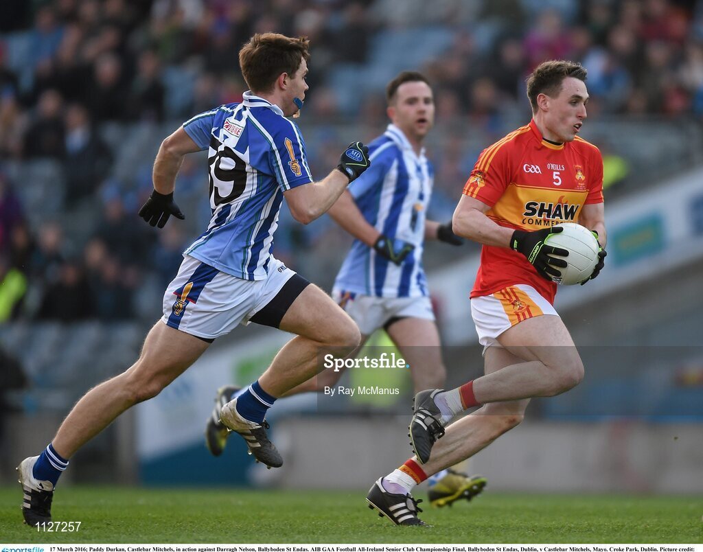 17 March 2016; Paddy Durkan, Castlebar Mitchels, in action against Darragh Nelson, Ballyboden St Endas. AIB GAA Football All-Ireland Senior Club Championship Final, Ballyboden St Endas, Dublin, v Castlebar Mitchels, Mayo. Croke Park, Dublin. Picture credit: Ray McManus / SPORTSFILE