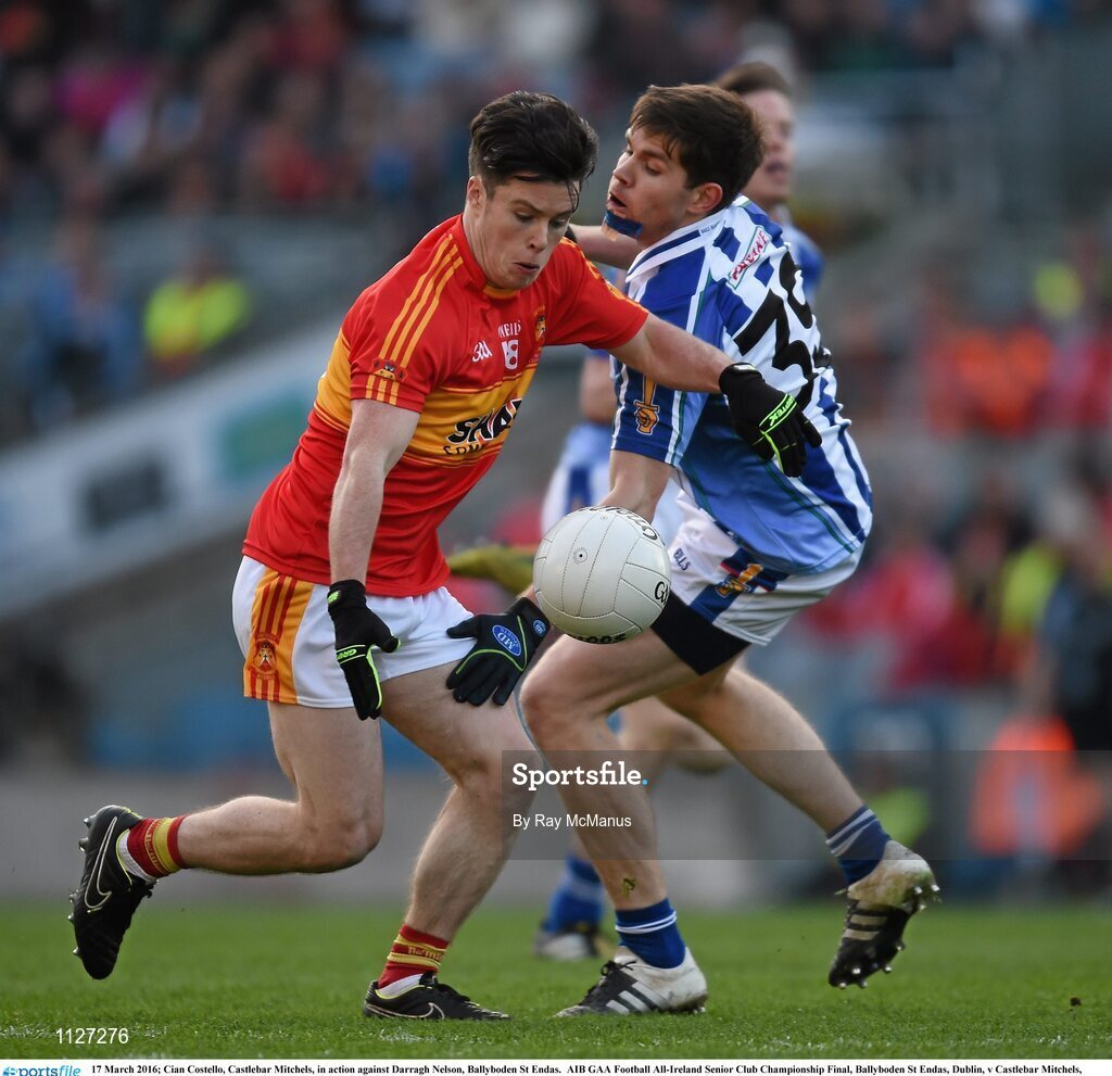 17 March 2016; Cian Costello, Castlebar Mitchels, in action against Darragh Nelson, Ballyboden St Endas. AIB GAA Football All-Ireland Senior Club Championship Final, Ballyboden St Endas, Dublin, v Castlebar Mitchels, Mayo. Croke Park, Dublin. Picture credit: Ray McManus / SPORTSFILE