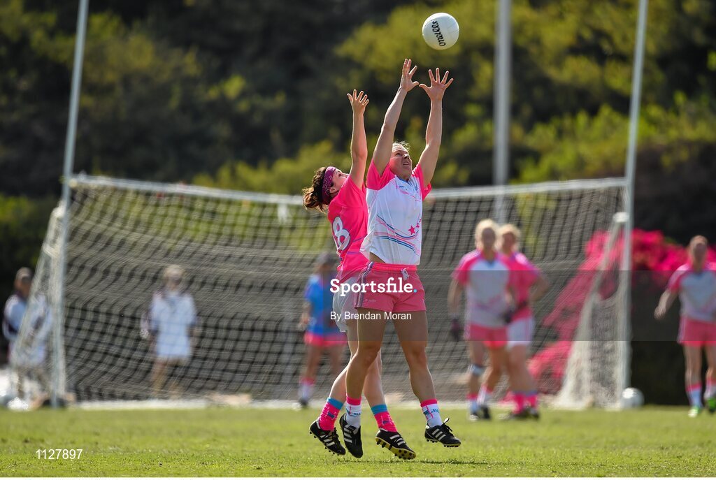 19 March 2016; Deirdre O'Reilly, Cork and 2014 All Stars, in action against Geraldine Conneally, Galway and 2015 All Stars. TG4 Ladies Football All-Star Tour, 2014 All Stars v 2015 All Stars. University of San Diego, Torero Stadium, San Diego, California, USA. Picture credit: Brendan Moran / SPORTSFILE