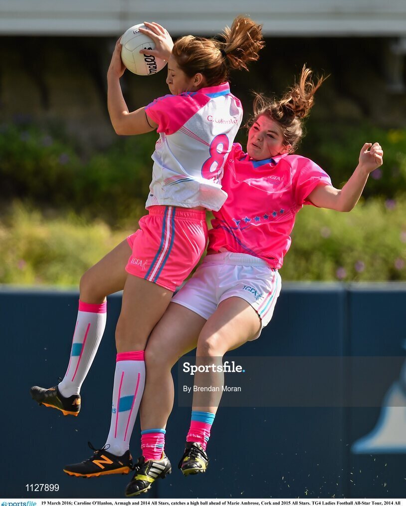 19 March 2016; Caroline O'Hanlon, Armagh and 2014 All Stars, catches a high ball ahead of Marie Ambrose, Cork and 2015 All Stars. TG4 Ladies Football All-Star Tour, 2014 All Stars v 2015 All Stars. University of San Diego, Torero Stadium, San Diego, California, USA. Picture credit: Brendan Moran / SPORTSFILE