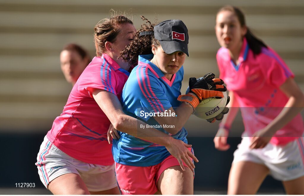 19 March 2016; Ciamh Dollard, Laois and 2014 All Stars, in action against Annie Walsh, Cork and 2015 All Stars. TG4 Ladies Football All-Star Tour, 2014 All Stars v 2015 All Stars. University of San Diego, Torero Stadium, San Diego, California, USA. Picture credit: Brendan Moran / SPORTSFILE