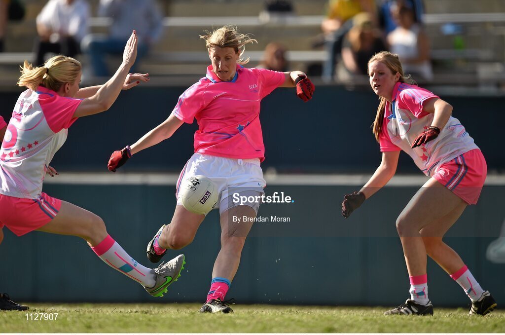 19 March 2016; Cora Staunton, Mayo and 2015 All Stars, in action against Angela Walsh, and Roisin Phelan, both Cork and 2014 All Stars. TG4 Ladies Football All-Star Tour, 2014 All Stars v 2015 All Stars. University of San Diego, Torero Stadium, San Diego, California, USA. Picture credit: Brendan Moran / SPORTSFILE