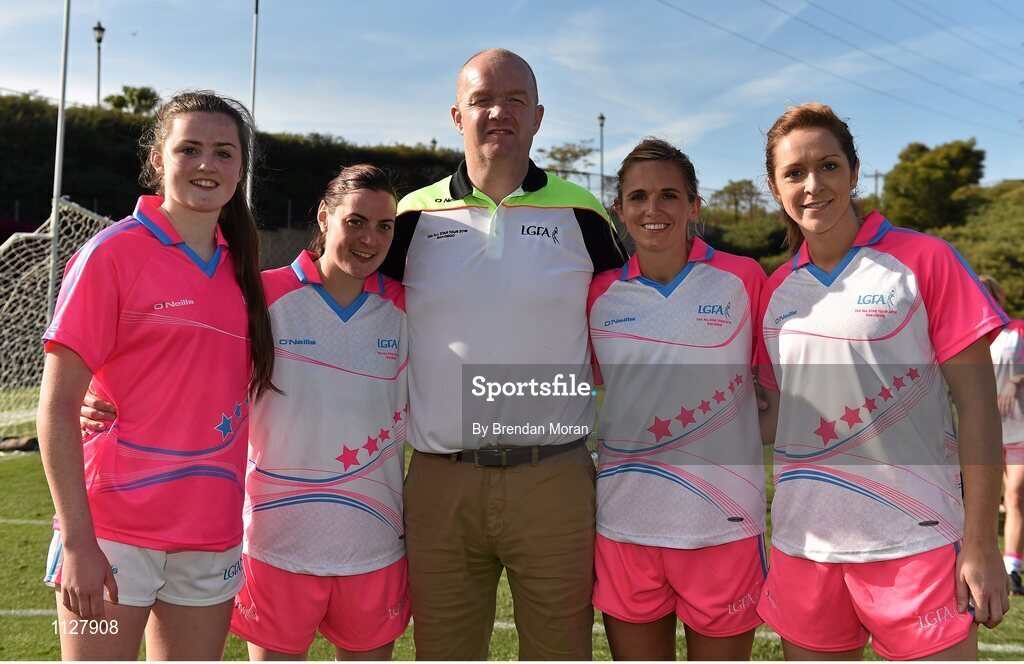 19 March 2016; Armagh Ladies Football All Stars, from left, Aimee Mackin, Mairead Tennyson, manager James Daly, Sinead Kernan and Caroline O'Hanlon after the game. TG4 Ladies Football All-Star Tour, 2014 All Stars v 2015 All Stars. University of San Diego, Torero Stadium, San Diego, California, USA. Picture credit: Brendan Moran / SPORTSFILE