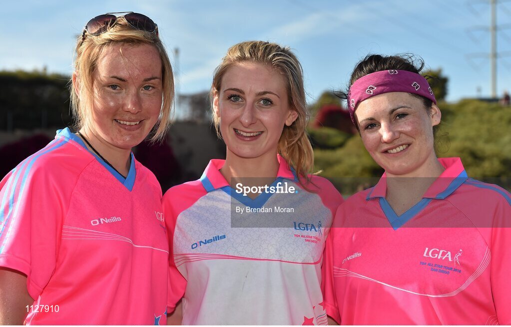 19 March 2016; Galway Ladies Football All Stars, from left, Tracey Leonard, Sinead Burke and Geraldine Conneally after the game. TG4 Ladies Football All-Star Tour, 2014 All Stars v 2015 All Stars. University of San Diego, Torero Stadium, San Diego, California, USA. Picture credit: Brendan Moran / SPORTSFILE