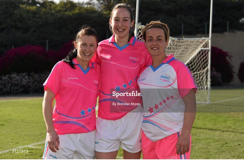19 March 2016; Ladies Football All Stars, from left, Linda Wall, Waterford, Aine Tighe, Leitrim, and Aileen Pyers, Down, after the game. TG4 Ladies Football All-Star Tour, 2014 All Stars v 2015 All Stars. University of San Diego, Torero Stadium, San Diego, California, USA. Picture credit: Brendan Moran / SPORTSFILE