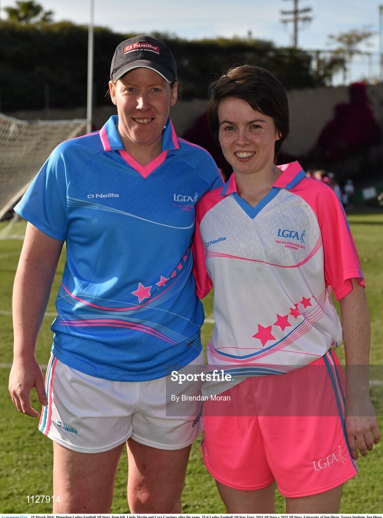 19 March 2016; Monaghan Ladies Football All Stars, from left, Linda Martin and Cora Courtney after the game. TG4 Ladies Football All-Star Tour, 2014 All Stars v 2015 All Stars. University of San Diego, Torero Stadium, San Diego, California, USA. Picture credit: Brendan Moran / SPORTSFILE