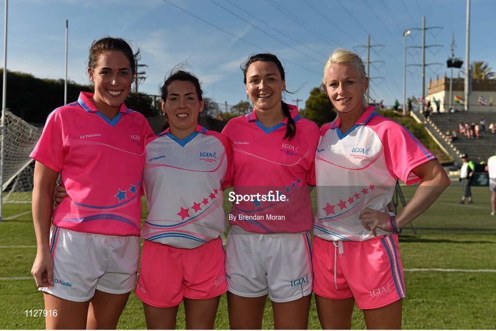 19 March 2016; Kerry Ladies Football All Stars, from left, Aislinn Desmond, Sarah Houlihan, Caroline Kelly and Bernie Breen after the game. TG4 Ladies Football All-Star Tour, 2014 All Stars v 2015 All Stars. University of San Diego, Torero Stadium, San Diego, California, USA. Picture credit: Brendan Moran / SPORTSFILE
