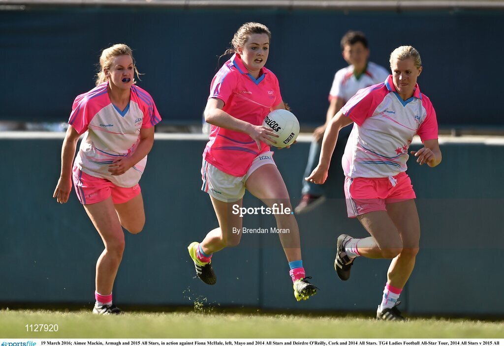 19 March 2016; Aimee Mackin, Armagh and 2015 All Stars, in action against Fiona McHale, left, Mayo and 2014 All Stars and Deirdre O'Reilly, Cork and 2014 All Stars. TG4 Ladies Football All-Star Tour, 2014 All Stars v 2015 All Stars. University of San Diego, Torero Stadium, San Diego, California, USA. Picture credit: Brendan Moran / SPORTSFILE
