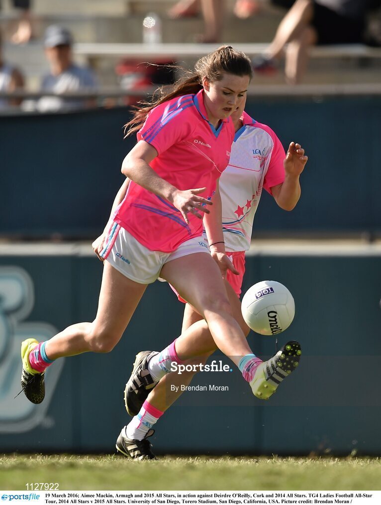 19 March 2016; Aimee Mackin, Armagh and 2015 All Stars, in action against Deirdre O'Reilly, Cork and 2014 All Stars. TG4 Ladies Football All-Star Tour, 2014 All Stars v 2015 All Stars. University of San Diego, Torero Stadium, San Diego, California, USA. Picture credit: Brendan Moran / SPORTSFILE