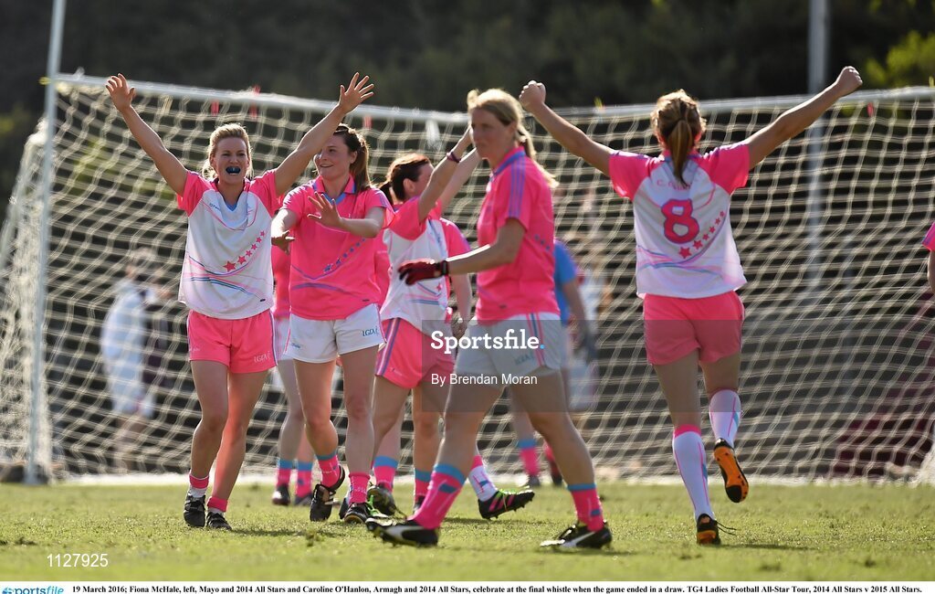19 March 2016; Fiona McHale, left, Mayo and 2014 All Stars and Caroline O'Hanlon, Armagh and 2014 All Stars, celebrate at the final whistle when the game ended in a draw. TG4 Ladies Football All-Star Tour, 2014 All Stars v 2015 All Stars. University of San Diego, Torero Stadium, San Diego, California, USA. Picture credit: Brendan Moran / SPORTSFILE
