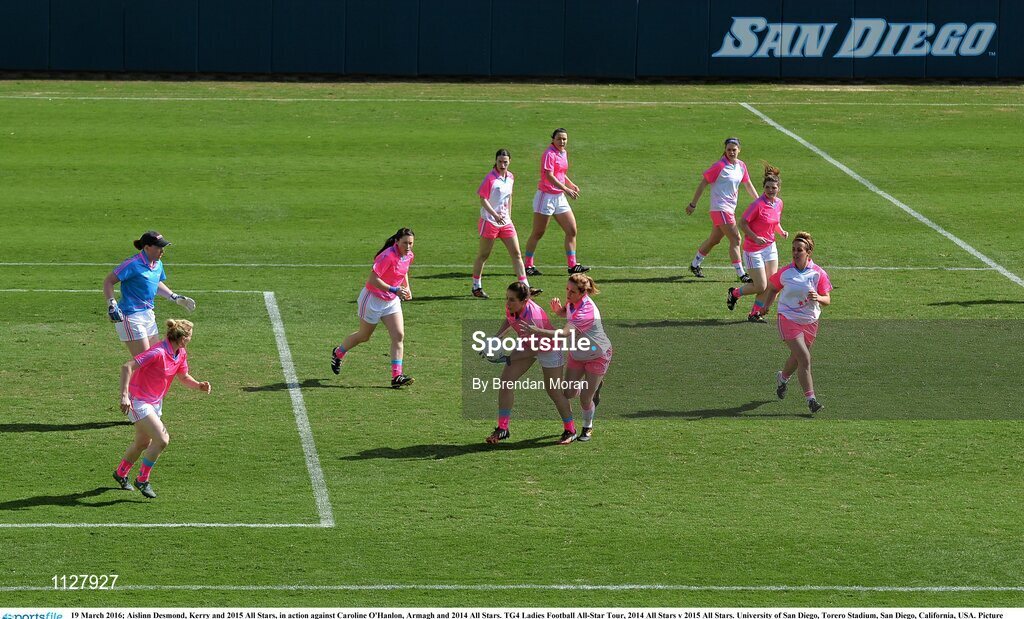 19 March 2016; Aislinn Desmond, Kerry and 2015 All Stars, in action against Caroline O'Hanlon, Armagh and 2014 All Stars. TG4 Ladies Football All-Star Tour, 2014 All Stars v 2015 All Stars. University of San Diego, Torero Stadium, San Diego, California, USA. Picture credit: Brendan Moran / SPORTSFILE
