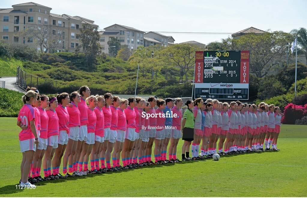 19 March 2016; The 2015 and 2014 All Star teams stand for the national anthems before the game. TG4 Ladies Football All-Star Tour, 2014 All Stars v 2015 All Stars. University of San Diego, Torero Stadium, San Diego, California, USA. Picture credit: Brendan Moran / SPORTSFILE