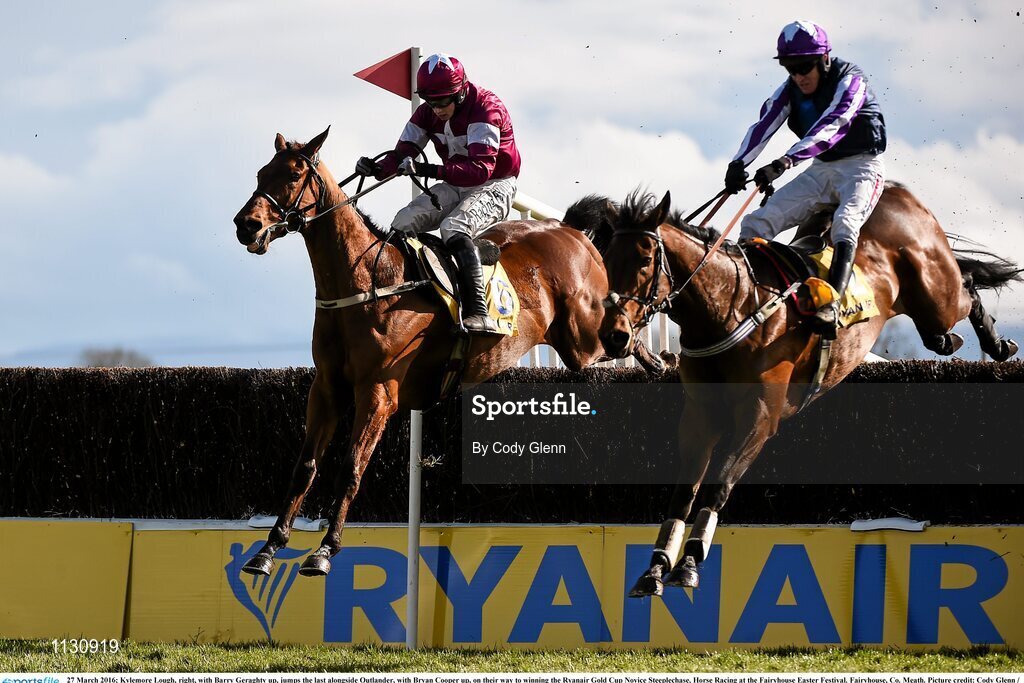 27 March 2016; Kylemore Lough, right, with Barry Geraghty up, jumps the last alongside Outlander, with Bryan Cooper up, on their way to winning the Ryanair Gold Cup Novice Steeplechase. Horse Racing at the Fairyhouse Easter Festival. Fairyhouse, Co. Meath. Picture credit: Cody Glenn / SPORTSFILE