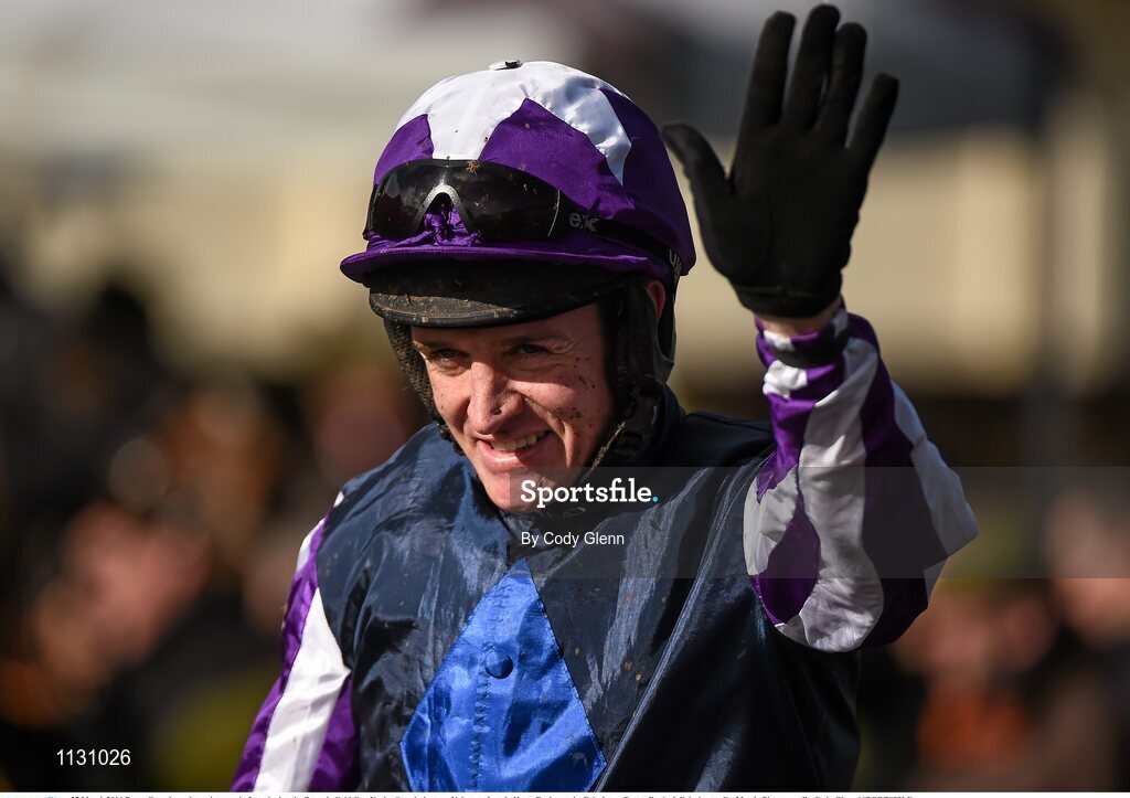 27 March 2016 Barry Geraghty salutes the crowd after winning the Ryanair Gold Cup Novice Steeplechase on Kylemore Lough. Horse Racing at the Fairyhouse Easter Festival. Fairyhouse, Co. Meath. Picture credit: Cody Glenn / SPORTSFILE