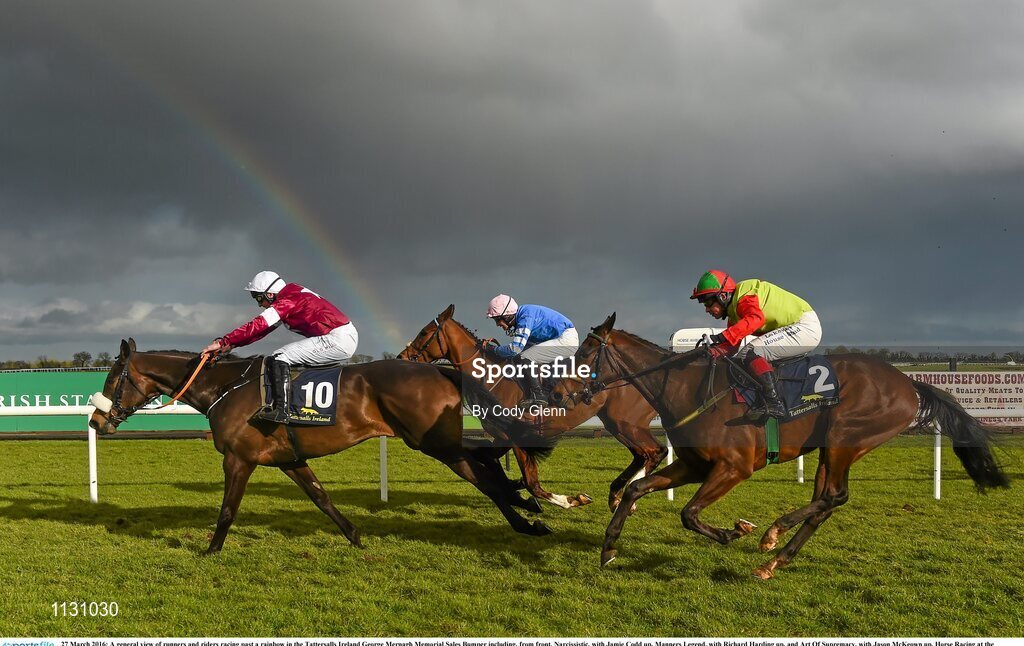 27 March 2016; A general view of runners and riders racing past a rainbow in the Tattersalls Ireland George Mernagh Memorial Sales Bumper including, from front, Narcissistic, with Jamie Codd up, Manners Legend, with Richard Harding up, and Art Of Supremacy, with Jason McKeown up. Horse Racing at the Fairyhouse Easter Festival. Fairyhouse, Co. Meath. Picture credit: Cody Glenn / SPORTSFILE