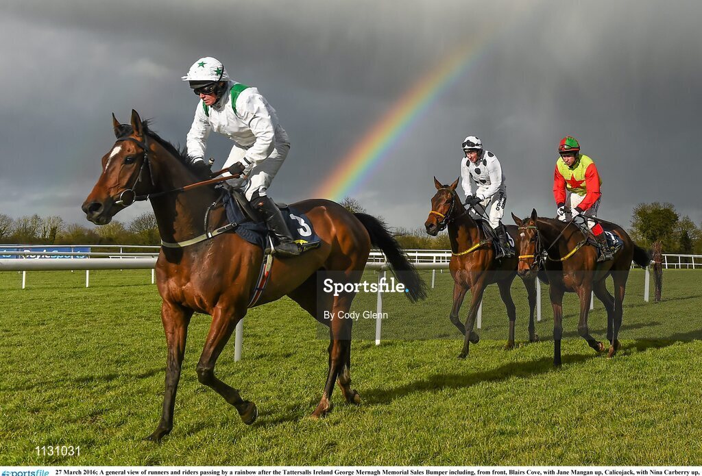 27 March 2016; A general view of runners and riders passing by a rainbow after the Tattersalls Ireland George Mernagh Memorial Sales Bumper including, from front, Blairs Cove, with Jane Mangan up, Calicojack, with Nina Carberry up, and Moscow River, with Steven Crawford up. Horse Racing at the Fairyhouse Easter Festival. Fairyhouse, Co. Meath. Picture credit: Cody Glenn / SPORTSFILE