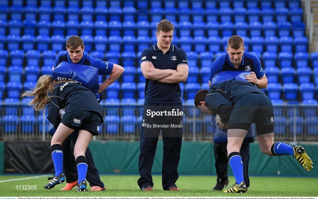 30 March 2016; Leinster Rugby stars, from left, Garry Ringrose, Josh van der Flier and Ross Molony are joined by Caoimhe Power, age 16, Navan RFC, and Sean Dunne, age 16, Lansdowne FC, at Donnybrook Stadium to mark the launch of the Bank of Ireland Leinster Rugby School of Excellence which will run in The King’s Hospital School, Palmerstown in July and August. Go to http://www.leinsterrugby.ie/domestic/SoE/leinster_school_of_excellence.php for more information. Donnybrook Stadium, Donnybrook, Dublin. Picture credit: Brendan Moran / SPORTSFILE