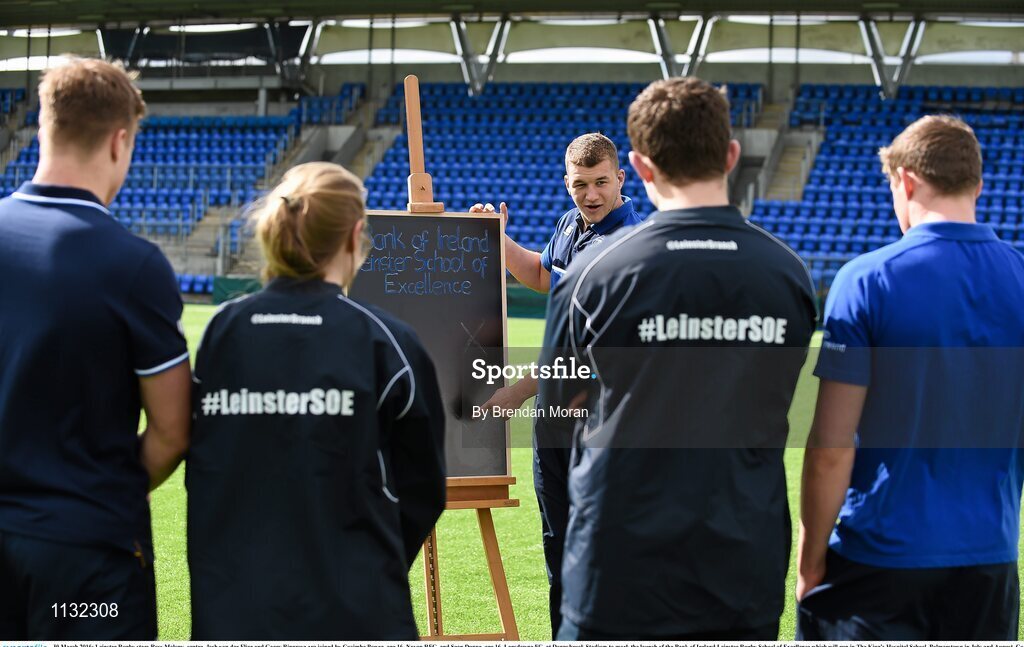 30 March 2016; Leinster Rugby stars Ross Molony, centre, Josh van der Flier and Garry Ringrose are joined by Caoimhe Power, age 16, Navan RFC, and Sean Dunne, age 16, Lansdowne FC, at Donnybrook Stadium to mark the launch of the Bank of Ireland Leinster Rugby School of Excellence which will run in The King’s Hospital School, Palmerstown in July and August. Go to http://www.leinsterrugby.ie/domestic/SoE/leinster_school_of_excellence.php for more information. Donnybrook Stadium, Donnybrook, Dublin. Picture credit: Brendan Moran / SPORTSFILE
