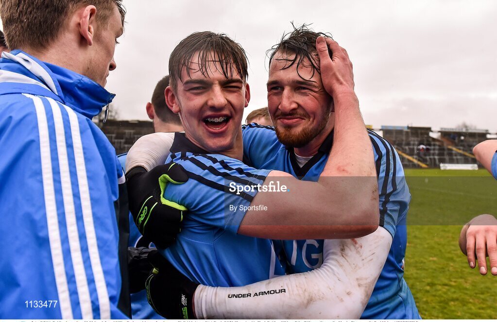 2 April 2016; Dublin players Sean McMahon, left, and Killian Deeley, celebrate after the game. EirGrid Leinster GAA Football U21 Championship Final, Dublin v Kildare. Páirc Táilteann, Navan, Co. Meath. Photo by Sportsfile