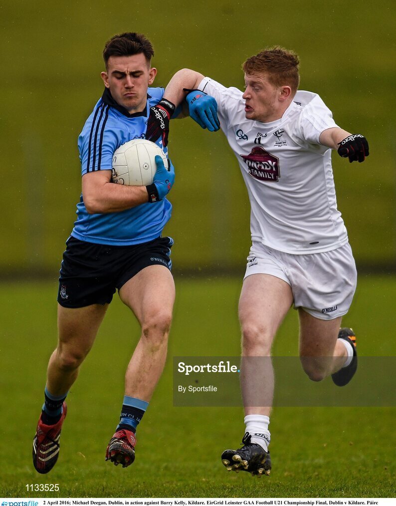 2 April 2016; Michael Deegan, Dublin, in action against Barry Kelly, Kildare. EirGrid Leinster GAA Football U21 Championship Final, Dublin v Kildare. Páirc Táilteann, Navan, Co. Meath. Photo by Sportsfile