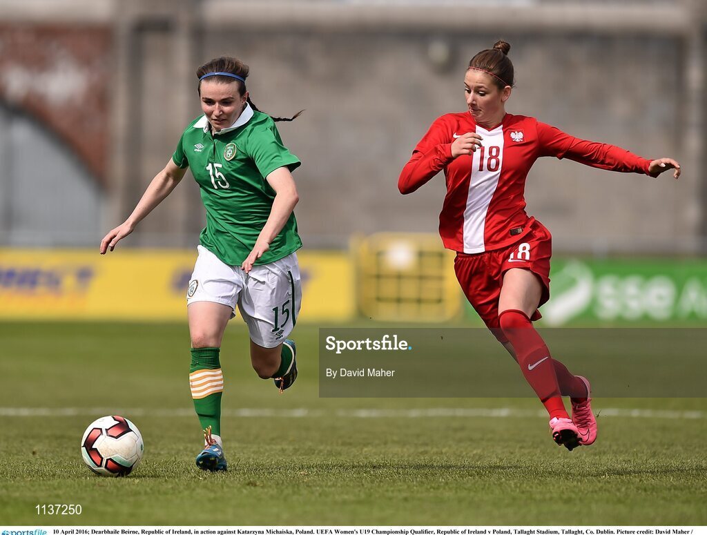 10 April 2016; Dearbhaile Beirne, Republic of Ireland, in action against Katarzyna Michaiska, Poland. UEFA Women's U19 Championship Qualifier, Republic of Ireland v Poland, Tallaght Stadium, Tallaght, Co. Dublin. Picture credit: David Maher / SPORTSFILE