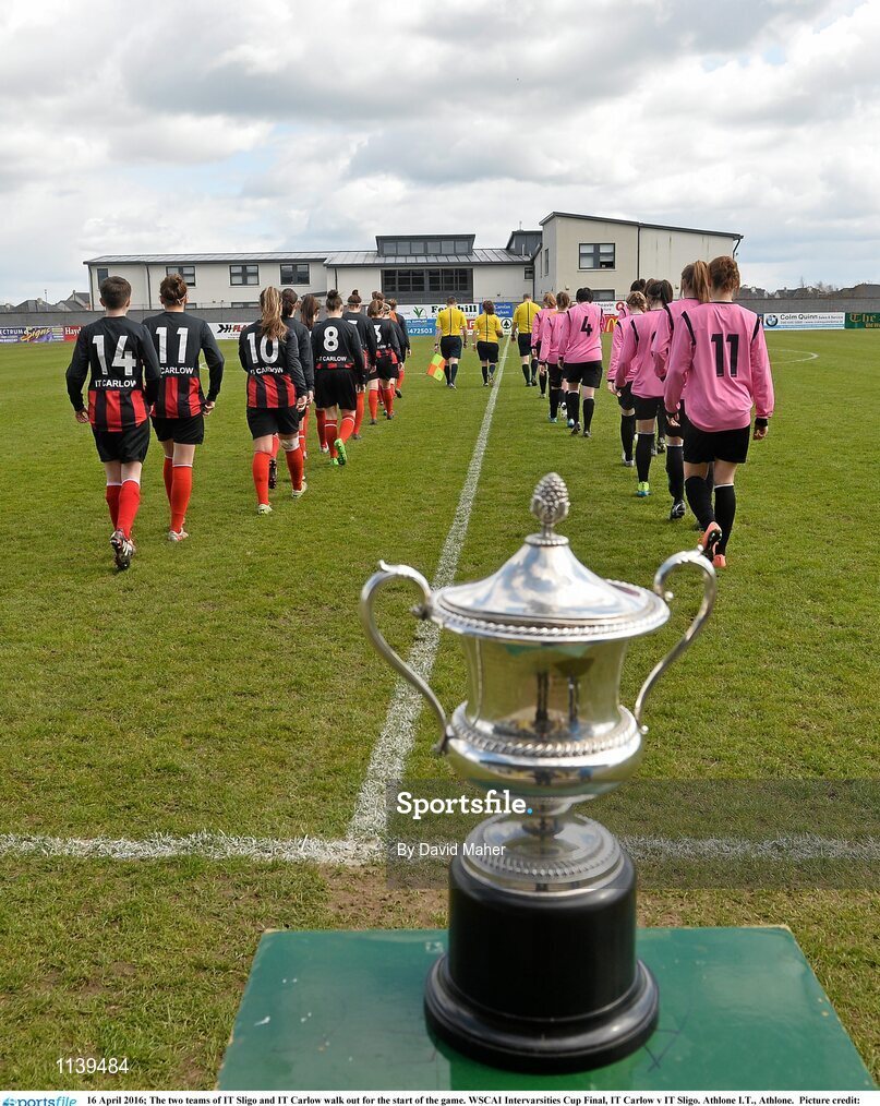 16 April 2016; The two teams of IT Sligo and IT Carlow walk out for the start of the game. WSCAI Intervarsities Cup Final, IT Carlow v IT Sligo. Athlone I.T., Athlone. Picture credit: David Maher / SPORTSFILE