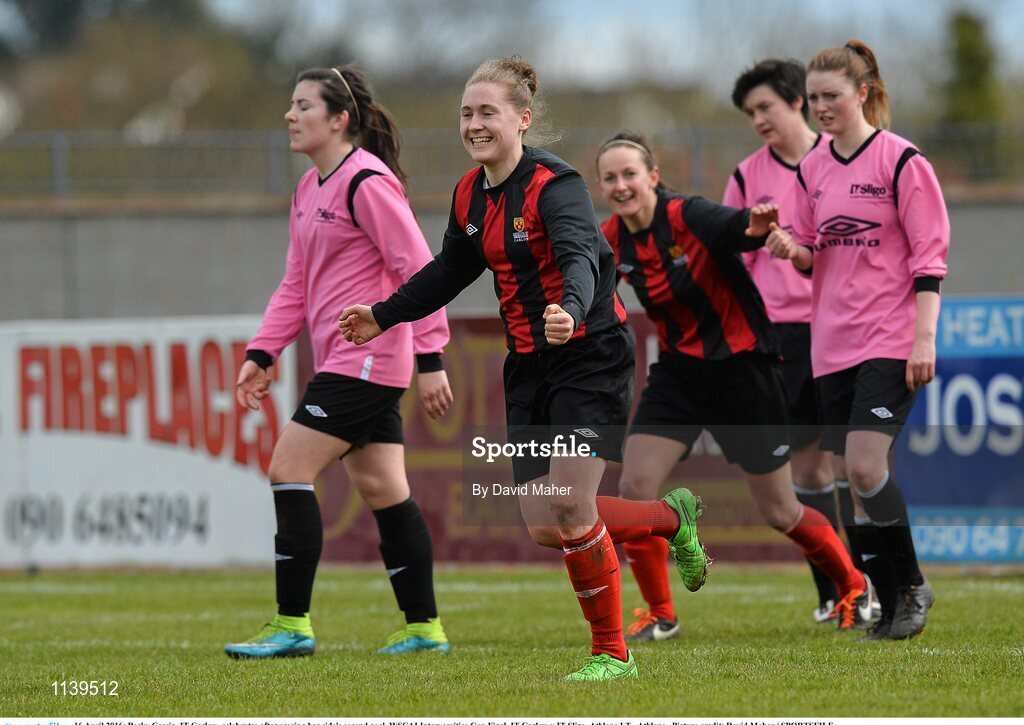 16 April 2016; Becky Cassin, IT Carlow, celebrates after scoring her side's second goal. WSCAI Intervarsities Cup Final, IT Carlow v IT Sligo. Athlone I.T., Athlone. Picture credit: David Maher / SPORTSFILE
