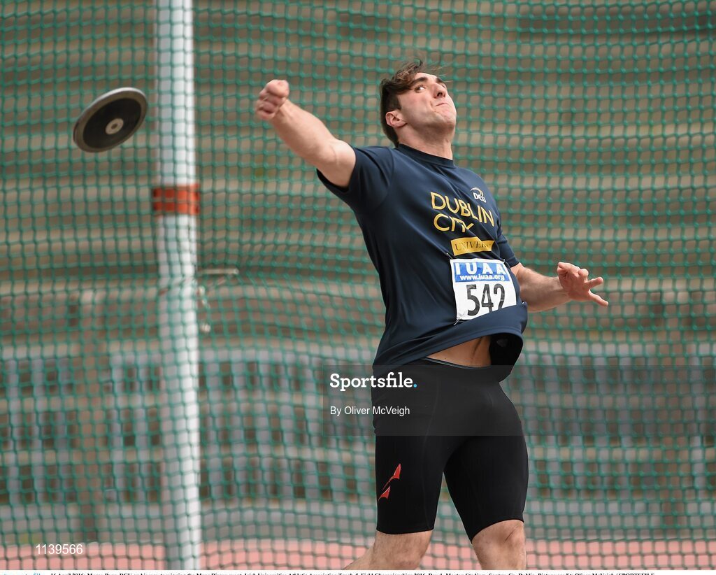 16 April 2016; Marco Pons, DCU on his way to winning the Mens Discus event. Irish Universities Athletic Association Track & Field Championships 2016, Day 1. Morton Stadium, Santry, Co. Dublin. Picture credit: Oliver McVeigh / SPORTSFILE