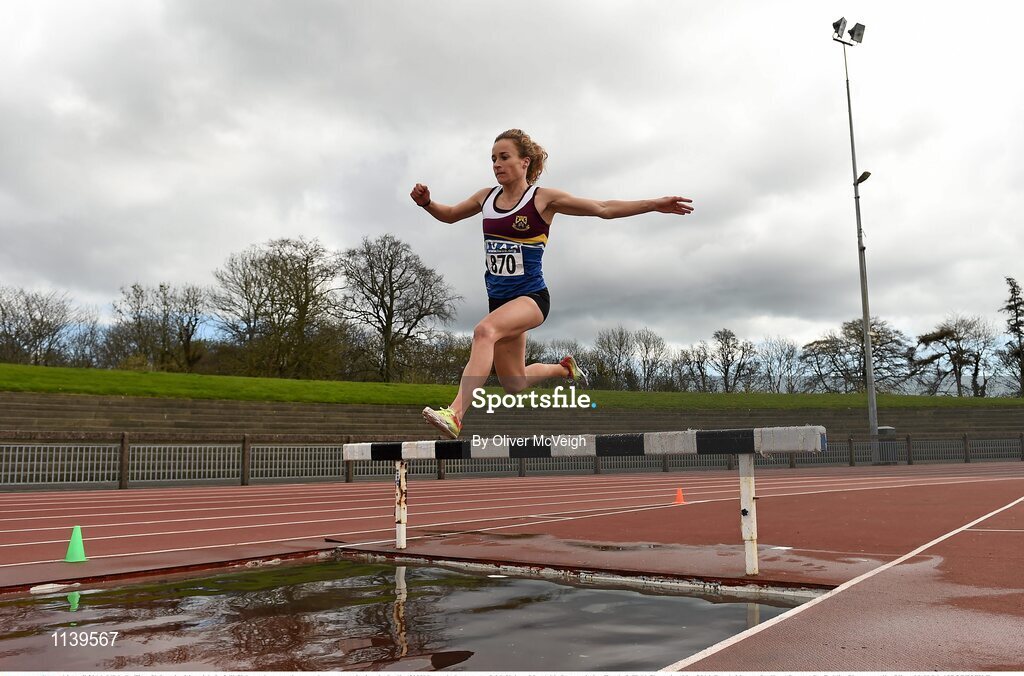 16 April 2016; Michelle Finn, University Limerick, in fulll flight at the water jump on her way to winning the Ladies 3000M steeplechase event. Irish Universities Athletic Association Track & Field Championships 2016, Day 1. Morton Stadium, Santry, Co. Dublin. Picture credit: Oliver McVeigh / SPORTSFILE