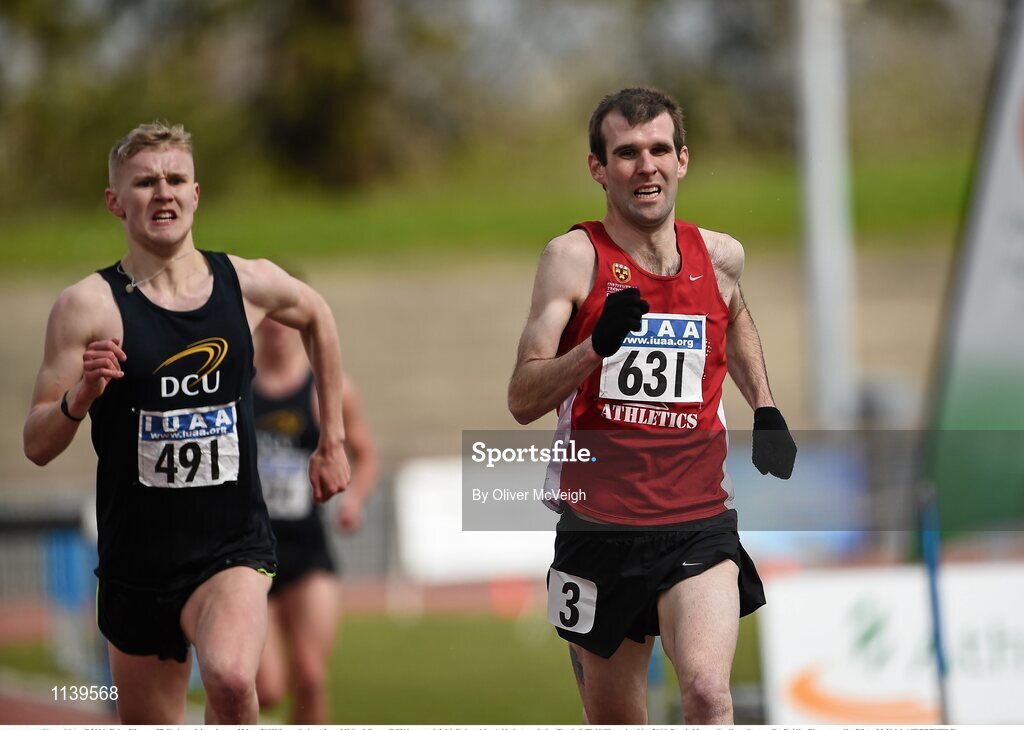 16 April 2016; Brian Kirwan, IT Carlow, right, winner of Mens 3000M steeplechase from Michael Carey, DCU in second. Irish Universities Athletic Association Track & Field Championships 2016, Day 1. Morton Stadium, Santry, Co. Dublin. Picture credit: Oliver McVeigh / SPORTSFILE