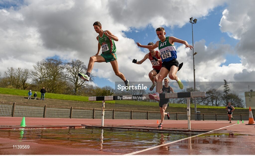 16 April 2016; Leaders in the mens 3000M steeplechase event. Irish Universities Athletic Association Track & Field Championships 2016, Day 1. Morton Stadium, Santry, Co. Dublin. Picture credit: Oliver McVeigh / SPORTSFILE
