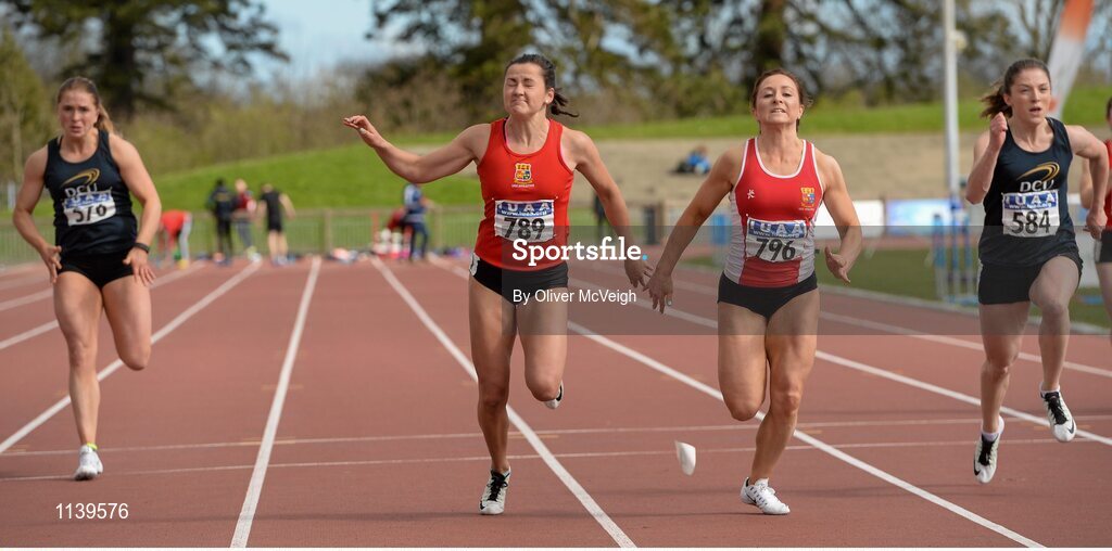 16 April 2016; Phil Healy, being pipped by her sister Joan Healy, both UCC to win the Ladies 100M event, during the AAA event. Irish Universities Athletic Association Track & Field Championships 2016, Day 1. Morton Stadium, Santry, Co. Dublin. Picture credit: Oliver McVeigh / SPORTSFILE