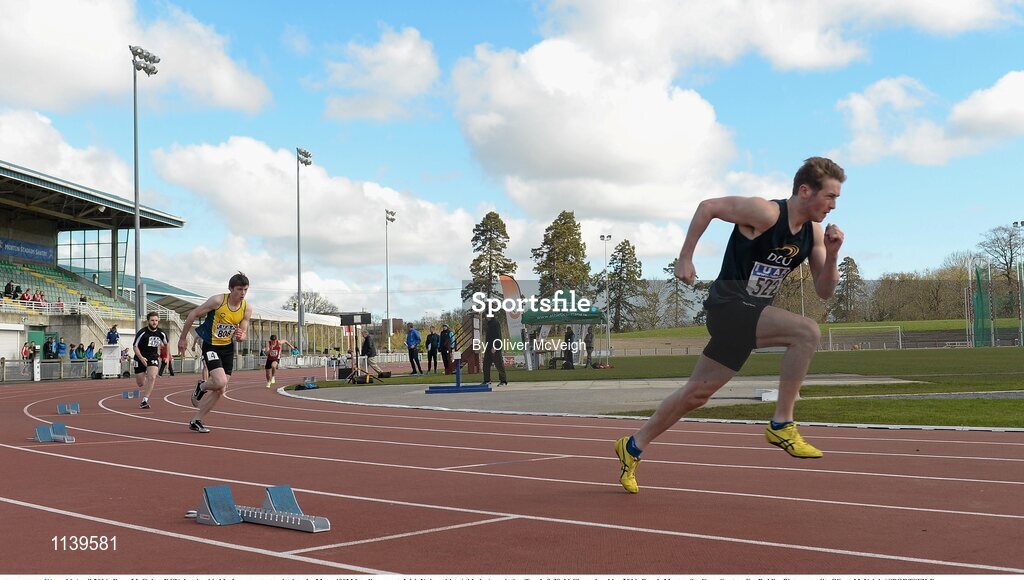 16 April 2016; Evan McGuire, DCU, leaving his blocks on route to winning the Mens 400M hurdles event. Irish Universities Athletic Association Track & Field Championships 2016, Day 1. Morton Stadium, Santry, Co. Dublin. Picture credit: Oliver McVeigh / SPORTSFILE