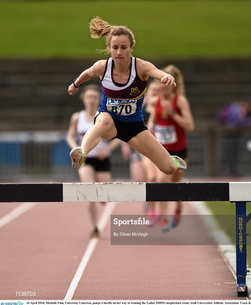 16 April 2016; Michelle Finn, University Limerick, jumps a hurdle on her way to winning the Ladies 3000M steeplechase event. Irish Universities Athletic Association Track & Field Championships 2016, Day 1. Morton Stadium, Santry, Co. Dublin. Picture credit: Oliver McVeigh / SPORTSFILE