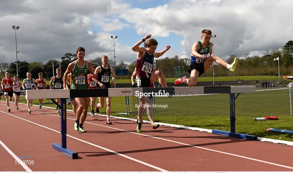 16 April 2016; Leaders in the mens 3000M steeplechase event. Irish Universities Athletic Association Track & Field Championships 2016, Day 1. Morton Stadium, Santry, Co. Dublin. Picture credit: Oliver McVeigh / SPORTSFILE
