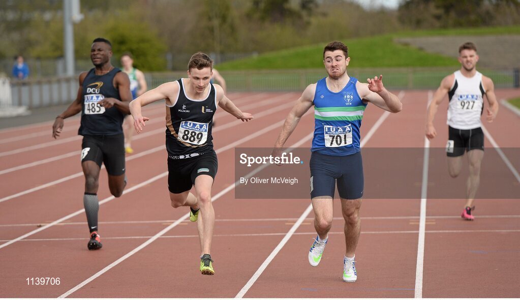 16 April 2016; Adaam McComb, University of Ulster, crosses the line in front of Andrew Mellon, Queens University Belfast, during the Mens 400M final. Irish Universities Athletic Association Track & Field Championships 2016, Day 1. Morton Stadium, Santry, Co. Dublin. Picture credit: Oliver McVeigh / SPORTSFILE