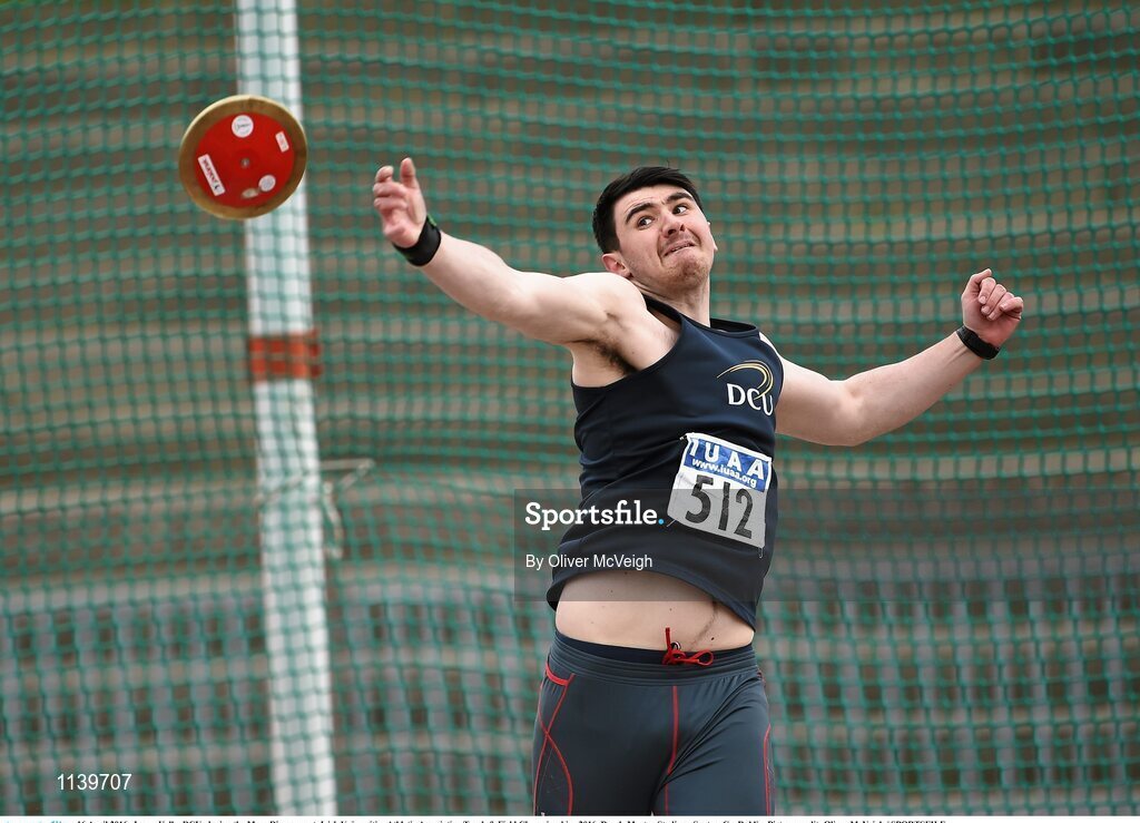 16 April 2016; James Kelly, DCU, during the Mens Discus event. Irish Universities Athletic Association Track & Field Championships 2016, Day 1. Morton Stadium, Santry, Co. Dublin. Picture credit: Oliver McVeigh / SPORTSFILE