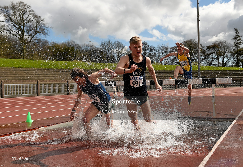 16 April 2016; Anrrew O'Donnaghaile, NUI Maynooth and Michael Carey, DCU during the Mens 3000M steeplechase event. Irish Universities Athletic Association Track & Field Championships 2016, Day 1. Morton Stadium, Santry, Co. Dublin. Picture credit: Oliver McVeigh / SPORTSFILE