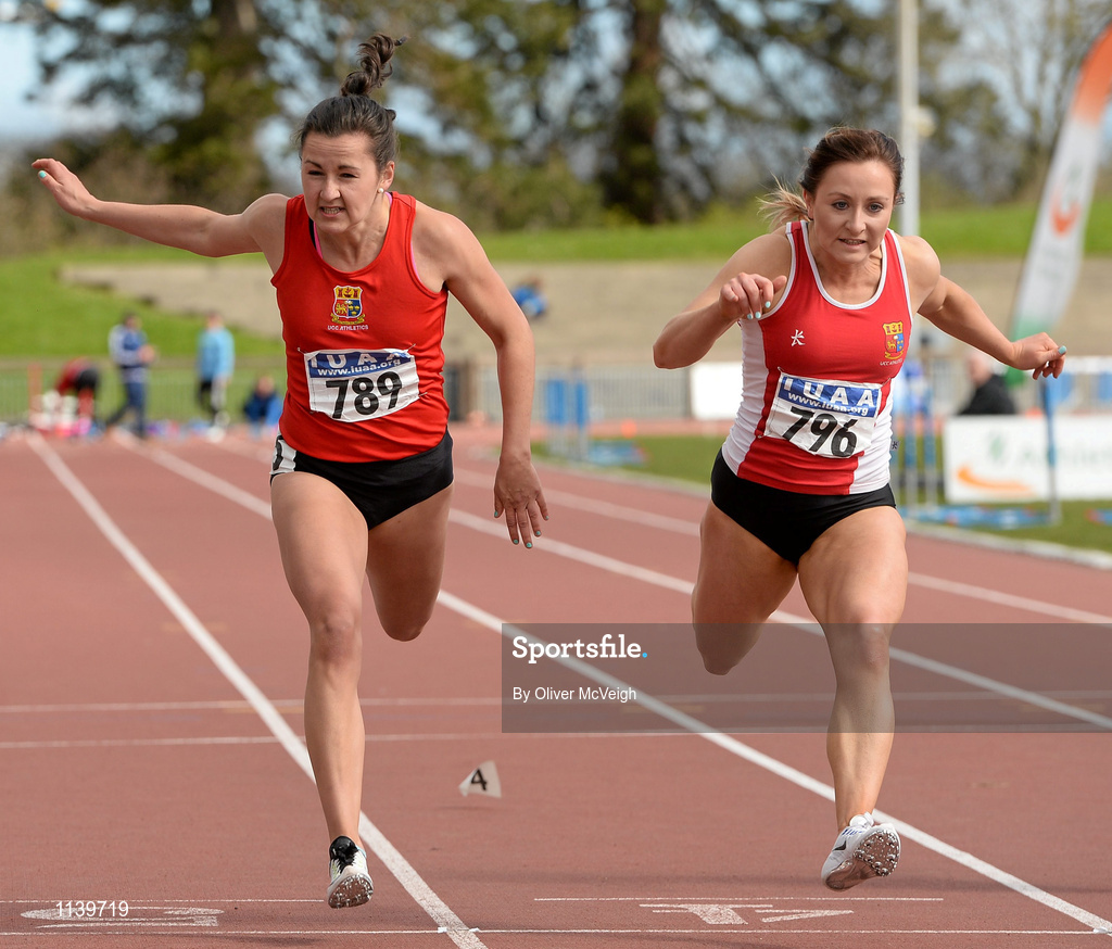 16 April 2016; Phil Healy loses to her sister Joan Healy, both UCC, to win the Ladies 100M event. Irish Universities Athletic Association Track & Field Championships 2016, Day 1. Morton Stadium, Santry, Co. Dublin. Picture credit: Oliver McVeigh / SPORTSFILE
