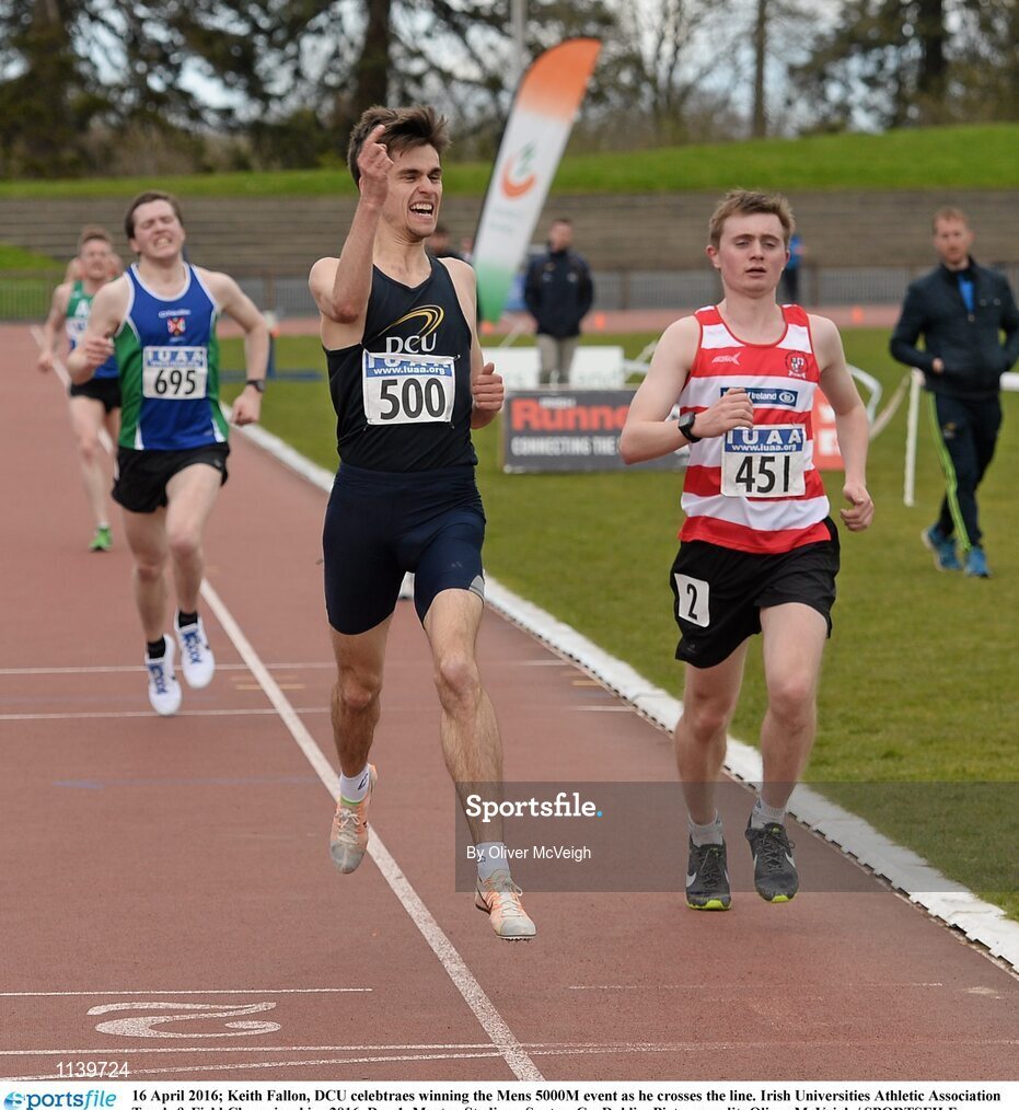 16 April 2016; Keith Fallon, DCU, celebrates winning the Mens 5000M event as he crosses the line. Irish Universities Athletic Association Track & Field Championships 2016, Day 1. Morton Stadium, Santry, Co. Dublin. Picture credit: Oliver McVeigh / SPORTSFILE