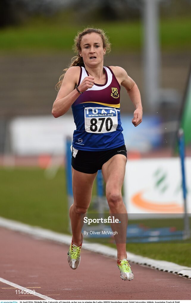 16 April 2016; Michelle Finn, University of Limerick, on her way to winning the Ladies 3000M Steeplechase event. Irish Universities Athletic Association Track & Field Championships 2016, Day 1. Morton Stadium, Santry, Co. Dublin. Picture credit: Oliver McVeigh / SPORTSFILE