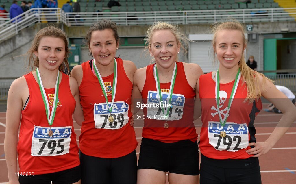 16 April 2016; The winning UCC team of the Womens 4*400M final, Louise Shanahan, Phil Healy, Christine Neville and Niamh Moore. Irish Universities Athletic Association Track & Field Championships 2016, Day 1. Morton Stadium, Santry, Co. Dublin. Picture credit: Oliver McVeigh / SPORTSFILE