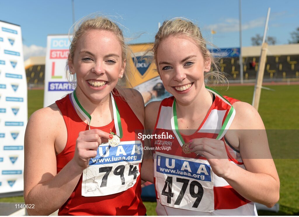 16 April 2016; Medal winning Sister different teams in the Ladies 4*400M final, Christine Neville, UCC, 1st, and Jessica Neville, Cork IT, 3rd. Irish Universities Athletic Association Track & Field Championships 2016, Day 1. Morton Stadium, Santry, Co. Dublin. Picture credit: Oliver McVeigh / SPORTSFILE
